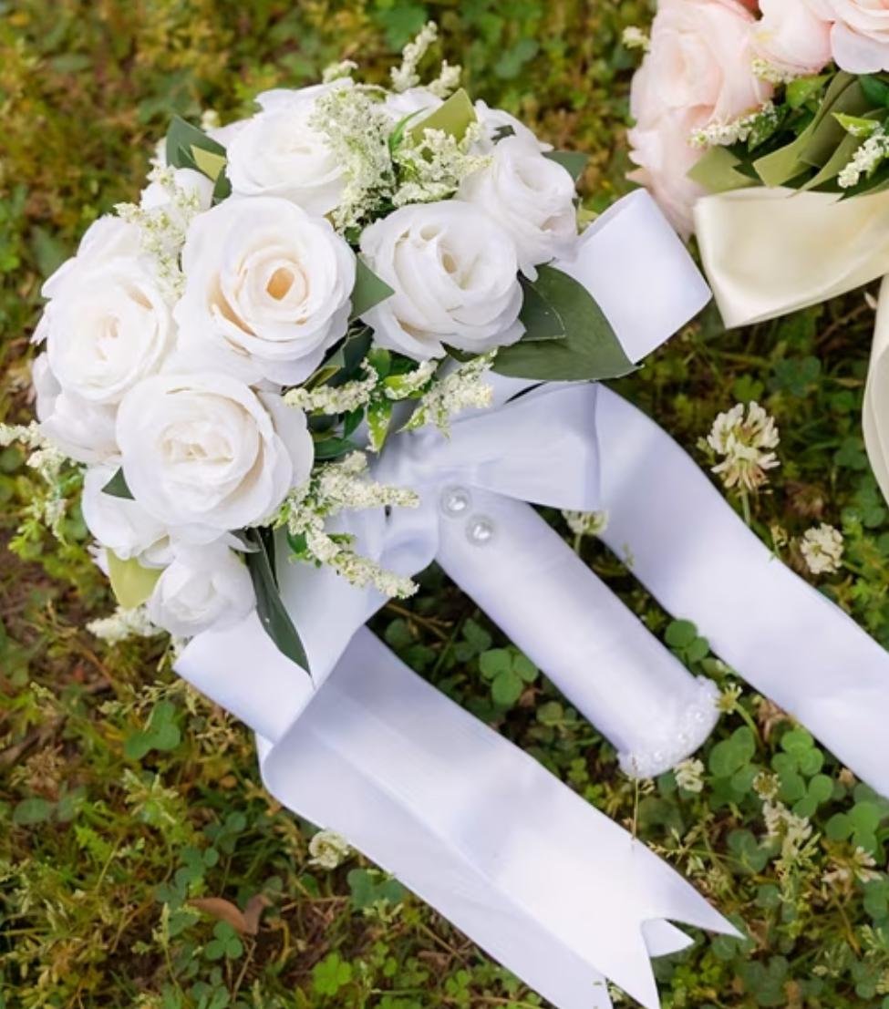 The Bride Bouquet in White Silk Roses with satin ribbon bow handle